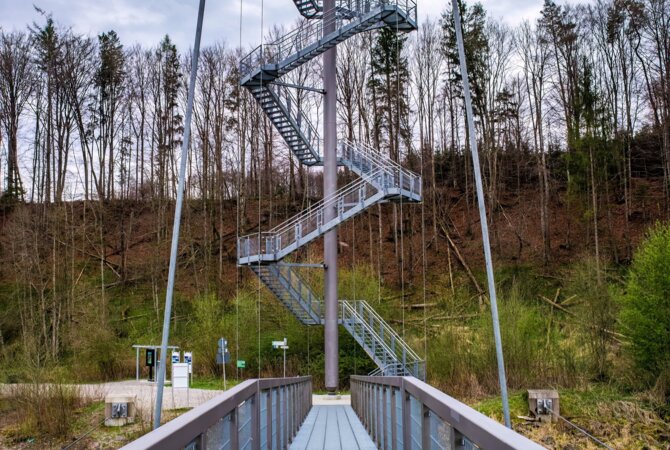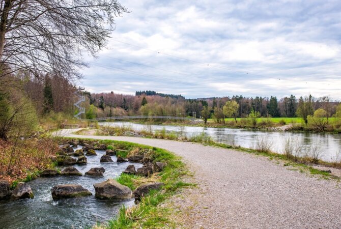 Entlang von Wiesen und Wäldern führt der Weg zum Aussichtsturm, der einen atemberaubenden Blick auf die Illerschleife, den Staudamm und die weiten Felder ermöglicht. Die 80 Meter lange Hängebrücke vor dem 23 Meter hohem Turm ist ein besonderes Highlight und bietet Kindern ein unvergessliches Erlebnis.