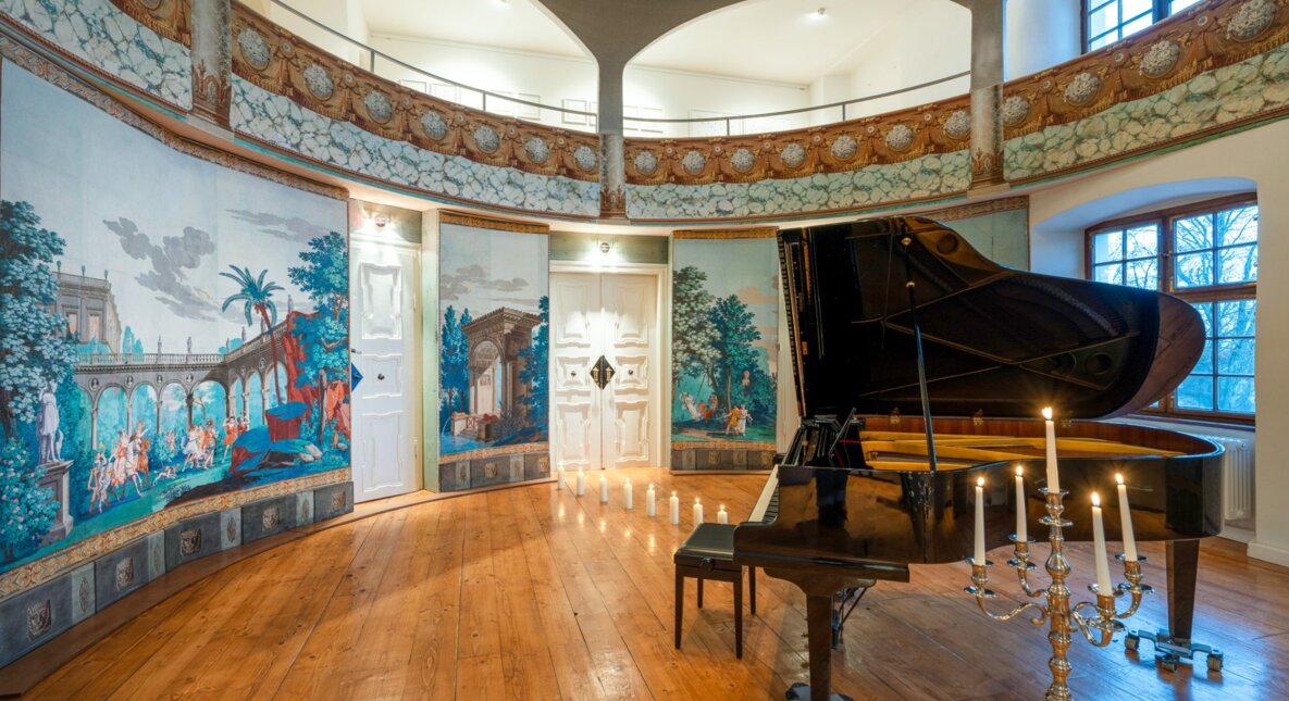 Unter diesem neuen Besitzer erhielt das Schloss im Jahr 1825 einen prächtigen zweigeschossigen Theatersaal, der mit handbedruckten Papiertapeten aus der Pariser Manufaktur Dufour ausgestattet wurde. Die Deckengemälde zeigten die "Toilette der Venus", während die Panoramatapete verschiedene Szenen aus den "Reisen des Anthenor" erzählte.